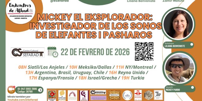 Read More »ENKONTROS DE ALHAD – 22 FEVRERO 2026: MICKEY EL EKSPLORADOR: INVESTIGADOR DE LOS SONOS DE ELEFANTES I PASHAROS – Balabaya: LILIANA BENVENISTE – Musafir: MICKEY PARDO – A las 13 oras (Arjentina) x Zoom – Mas orarios en el anunsio