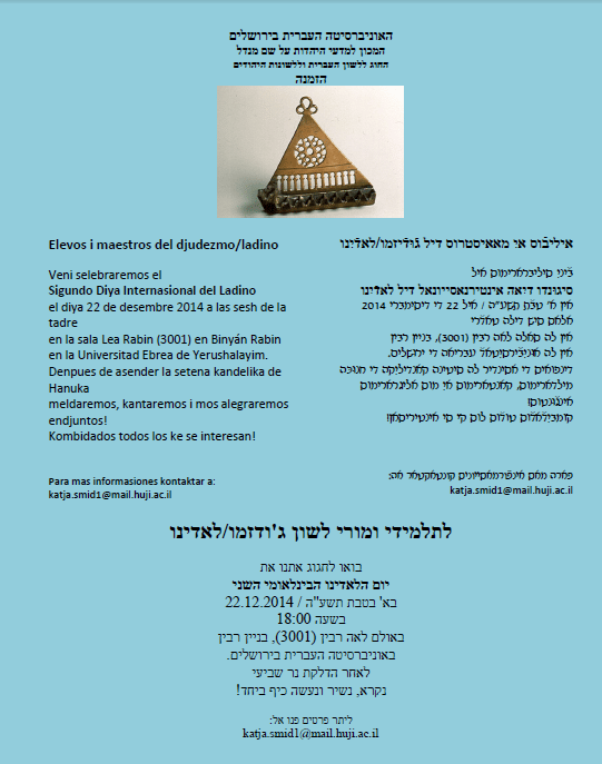 Veni selebraremos el Sigundo Diya Internasional del Ladino el diya 22 de desembre 2014 a las sesh de la tadre en la sala Lea Rabin (3001) en Binyán Rabin en la Universitad Ebrea de Yerushalayim.