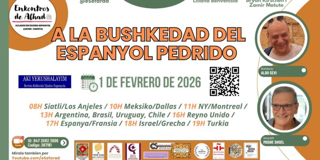 Donativo para ayudar a Enkontros de Alhad ENKONTROS DE ALHAD Avlados en Djudeo-espanyol – Ladino i Haketia – 1 de FEVRERO 2026 08:00 Siatli/Los Anjeles – 10:00 Meksiko/Dallas 11:00 Niu York/ Toronto/Montreal 13:00 Arjentina/Brasil/Uruguay /Chile 16:00 Reyno Unido – 17:00 Espanya/Fransia/Marroko 18:00 Israel/Grecha – 19:00 Turkia A LA BUSHKEDAD DEL ESPANYOL PEDRIDO …