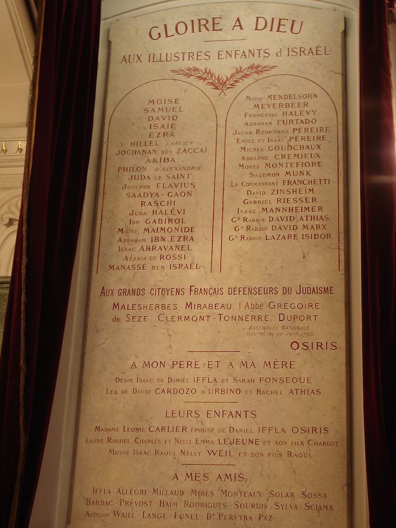 Osiris, habiendo dado una suma muy grande para la construcción de la sinagoga, quería imponer la colocación de las placas de agradecimiento, ignorando a los otros donantes. La comunidad se opuso, lo que llevó a un procedimiento legal, antes de un acuerdo amistoso. Una de las placas más problemáticas de la comunidad y los rabinos es donde Osiris rinde homenaje a «los hijos ilustres de Israel». Aunque la mayoría de los nombres no causaron ningún problema, el rabinato se negó a mencionar los nombres de Baruch Spinoza debido a su herejía y Heinrich Heine debido a su conversión al protestantismo.