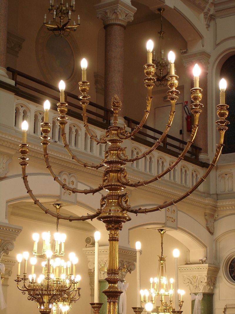 Las arañas y los candelabros son muy hermosos, especialmente el candelero con 8 brazos. Una balaustrada de piedra rodea la Tevá. En el techo, cuatro rosetas ocupan las cuatro partes centrales de la nave.
