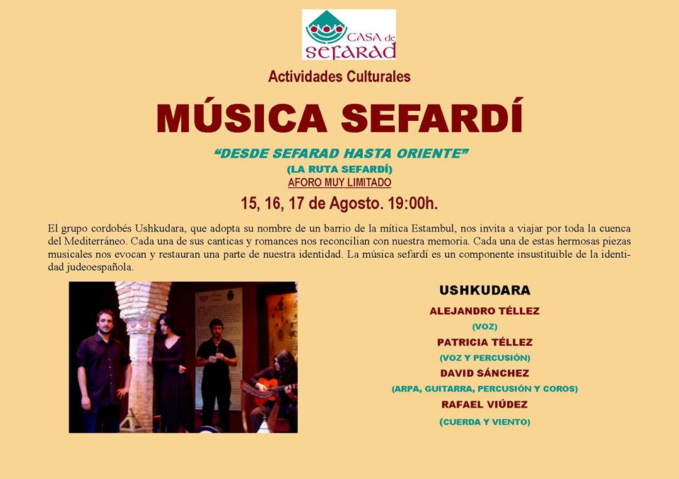 El grupo cordobés Ushkudara que adopta su nombre de un barrio de la mítica Estambul, nos invita a viajar por toda la cuenca del Mediterráneo.Cada una de sus canticas y romances nos reconcilian con nuestra memoria. Cada una de estas hermosas piezas musicales nos evocan y restauran un parte de nuestra identidad. La música sefardí es un componente insustituible de la identidad judeoespañola.