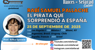 – – – – – – – – – – – – – RAÍCES DE SEFARAD / ONLINE Jueves 25 de Septiembre 2025 Conferencia RABI SAMUEL PALLACHE, EL PIRATA QUE SORPRENDIO A ESPAÑA con RIFKA EPSTEIN ————————— 14 hs Los Ángeles – 15 hs México 17 hs New York/Miami – 18 hs …
