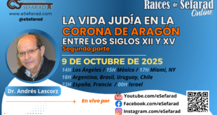– – – – – – – – – – – – – RAÍCES DE SEFARAD / ONLINE Jueves 9 de Octubre 2025 Conferencia LA VIDA JUDÍA EN LA CORONA DE ARAGON Entre los siglos XII y XV PARTE 2 con ANDRÉS LASCORZ ————————— 14 hs Los Ángeles – 15 …