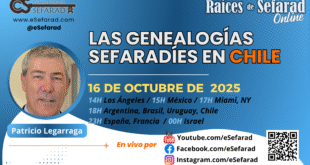 – – – – – – – – – – – – – RAÍCES DE SEFARAD / ONLINE Jueves 16 de Octubre 2025 Conferencia LAS GENEALOGÍAS JUDIAS EN CHILE con PATRICIO LEGÁRRAGA ————————— 14 hs Los Ángeles – 15 hs México 17 hs New York/Miami – 18 hs Argentina/Brasil/Uruguay/Chile 22 hs Portugal/Reino …