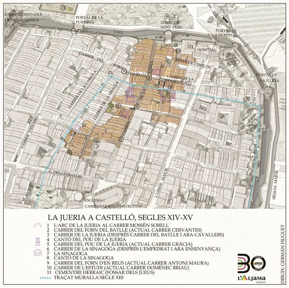 La asociación cultural l’Aljama de Castelló ha puesto el mejor broche al año de su trigésimo aniversario con la rotulación, en colaboración con la Concejalía de Cultura del Ayuntamiento de Castelló, de 11 placas conmemorativas que recuerdan la denominación de las calles en las que se ubicaba en los siglos XIV y XV la comunidad judía de la villa medieval.