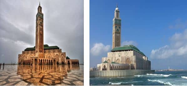 La meskita es fraguada ensima de una roka en frente del Oseano Atlantiko. Su unika minaret es el mas alto del mundo kon 210 metros. Siendo alleshado del trafik de la sivdad, es fasil de yegar a este lugar kalmo, perfektamente limpyo siempre. Komo lo savesh, kale kitar los kalsados antes de entrar aryenyo. Se oyen solo los pasharikos ke kantan, la briza i las olas de la mar…