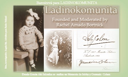 - Kaminos de vida con Ladinokomunita. “Entre las guertas paseando entre el jazmin, vive una hija mui ermoza enfrente de mi…”. Con esta hermosa kantika interpretada por Liliana Benveniste, recibimos a Rachel Amado Bornick. Rachel nació en Esmirna, Turquía, hija Joseph Amado-Sadikario y Sara Algranti-Hasson, mujer de voluntad e inmenso amor por la lengua judeoespañola, el ladino. Raquelita y Ladinokomunita http://groups.yahoo.com/group/Ladinokomunita/ están de cumpleaños. 13 años, Bar mitzvá ! con 1.450 miembros de 34 países.“Los objetivos más mucho de todo es mantener la lengua viva. Ladinokomunita es un manadero mui rico”- nos dice. “Mosotros regransemos de corazón a Ladinokomunita por existir”. Fotos archivo RB.[LAD] [ESP]