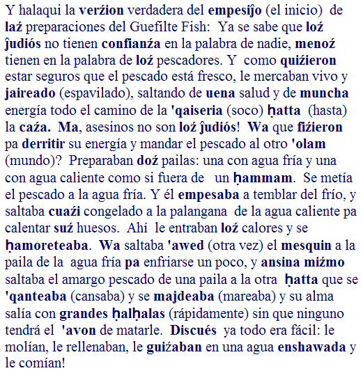 Hoy tenemos un nuevo cuento que «engaña» desde su nombre “El cuentito del Guefilte Fish” también en haketia esta vez con la grafía ‘extendida’ muy utilizada para escribir este idioma que tiene origene en el espoañol antiguo y que evolucionó en especial en Marruecos por lo cual es hablado por judíos oriundos y descendientes del norte de África.