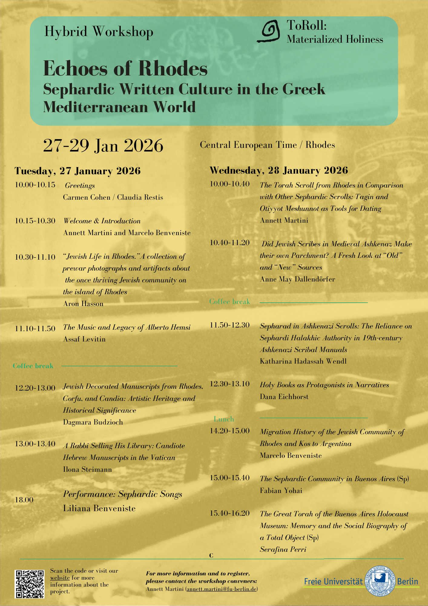 10.00–10.40 Annett Martini: The Torah Scroll from Rhodes in Comparison with Other Sephardic Scrolls: Tagin and Otiyyot Meshunnot as Tools for Dating