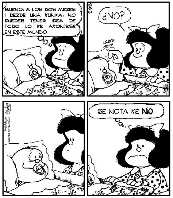 Mafalda es una karikatura arjentina publikada de 1964 a 1973 kreada por el umorista konosido komo Quino.  Es una kriatura de sesh anyos ke reflekta los djovenos de al tiempo, preokupados por la sosieta i la paz en el paiz i en el mundo.