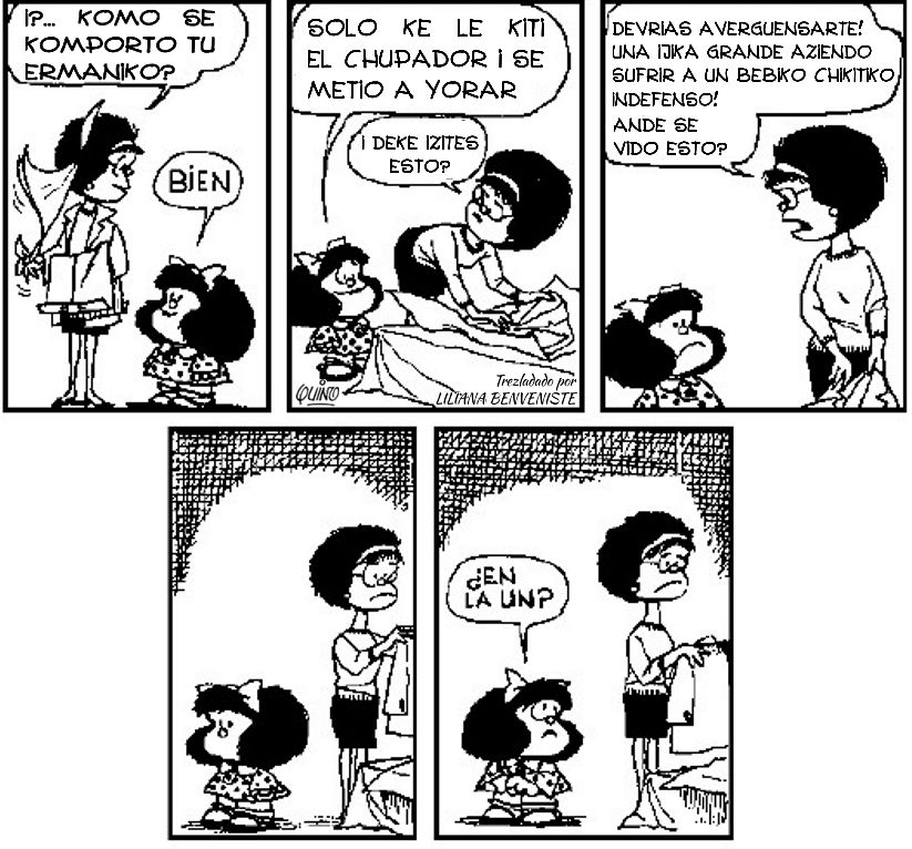 Mafalda es una karikatura arjentina publikada de 1964 a 1973 kreada por el umorista konosido komo Quino. Es una kriatura de sesh anyos ke reflekta los djovenos de al tiempo, preokupados por la sosieta i la paz en el paiz i en el mundo.