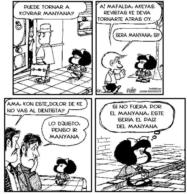 Mafalda es una karikatura arjentina publikada de 1964 a 1973 kreada por el umorista konosido komo Quino.  Es una kriatura de sesh anyos ke reflekta los djovenos de al tiempo, preokupados por la sosieta i la paz en el paiz i en el mundo.