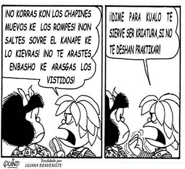 Mafalda es una ninya kurioza, inkieta i muy muncho ironika, nasida de una típica famiya de la sivdad de Buenos Aires. En un kuerpo de ninya eya muestra la reveldía de la mansevez markada por el progresismo. Empero Mafalda es una revelde djuisioza, no es una destruktora anarkika del mundo. Es arespondedora, kon un meoyo avierto i disposta a filozofar a partir de kualker fakto de kada diya. Reprezenta la ambision idealista i utopika de azer de éste un mundo mijor, mizmo ke la emburuja el pesimismo i se merekiya kuaji todo el tiempo por morde lo ke akontese. Le plazeria ambezar linguas i lavorar de interprete en las Nasiones Unidas para kontribuyir a la paz mundiala. Mafalda está konvensida del progreso sosial de la mujer i lo proteje fuertemente, algo abastante adelantado a su epoka.