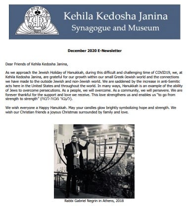 As we approach the Jewish Holiday of Hanukkah, during this difficult and challenging time of COVID-19, we, at Kehila Kedosha Janina, are grateful for our growth within our small Greek-Jewish world and the connections we have made to the outside Jewish and non-Jewish world. We are saddened by the increase in anti-Semitic acts here in the United States and throughout the world. In many ways, Hanukkah is an example of the ability of Jews to overcome persecutions. As a people, we will overcome. As a community, we will persevere. We are forever thankful for the support and love we receive. This love strengthens us and enables us “to go from strength to strength.”