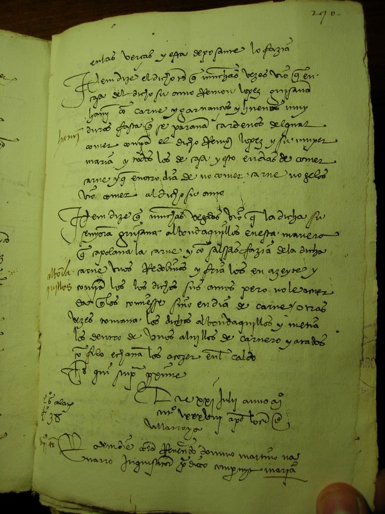- El 4 de marzo de 1488, el judío de Calatayud, Yuçe Buenavida, declara ante el tribunal de la inquisición que juzga de judaizar al converso, Alfonso de Sancta Cruz, que el acusado “enviava les tambien cada viernes quatro o cinquo guebos rogando le a este deposante que los garvanços que los puessiese de su casa este deposante y este deposante quando se fallava o la dicha Aljaffar su muxer mercaban carne de los dicho dines que les enviava el dicho Alfonso de Sancta Cruz de la carnicería de los judios y los dichos viernes para los sabados segunt paresce deposante se guisava en su casa guisaban el hamin junto con el suyo en huna olla[4]”.