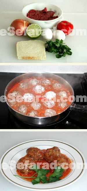 la carne, huevo, cebolla, pan, aceite de perejil, y condimentos. Formar bolas ligeramente más pequeño que las pelotas de golf. Pasar estas por la harina. Preparar la salsa mezclando los ingredientes