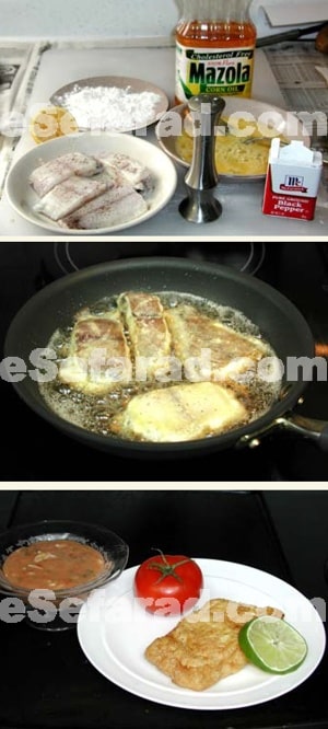 Limpiar el pescado y cortar en trozos adecuados. Sazonar y colocar en un plato con el jugo de limón durante 15 minutos (no más). Secar las porciones. Bañar en la harina, sacudir el exceso y luego sumerjir en el huevo batido. Freír en aceite bien caliente (375 ° F) (190 ° C) de ambos lados hasta que estén doradas.
