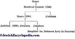 Su nieto, Moshe ben Yonatan Galante , nacido en 1621 en Tsfat , fue el primer Risho n Le´Zion que hubo ; fue apodado Maguen (מגן, escudo) en su yeshiva, con unos 80 talmidím más, estudió Ezequías de Silva, otro sefardí, de Livorno, enterrado en el Monte de los Olivos. Su heredero en el Gran Rabinato sería Moshé Miyujás. Este tuvo un hijo, Yonatán, rabino en Tsfat, que fue padre de Moshé.