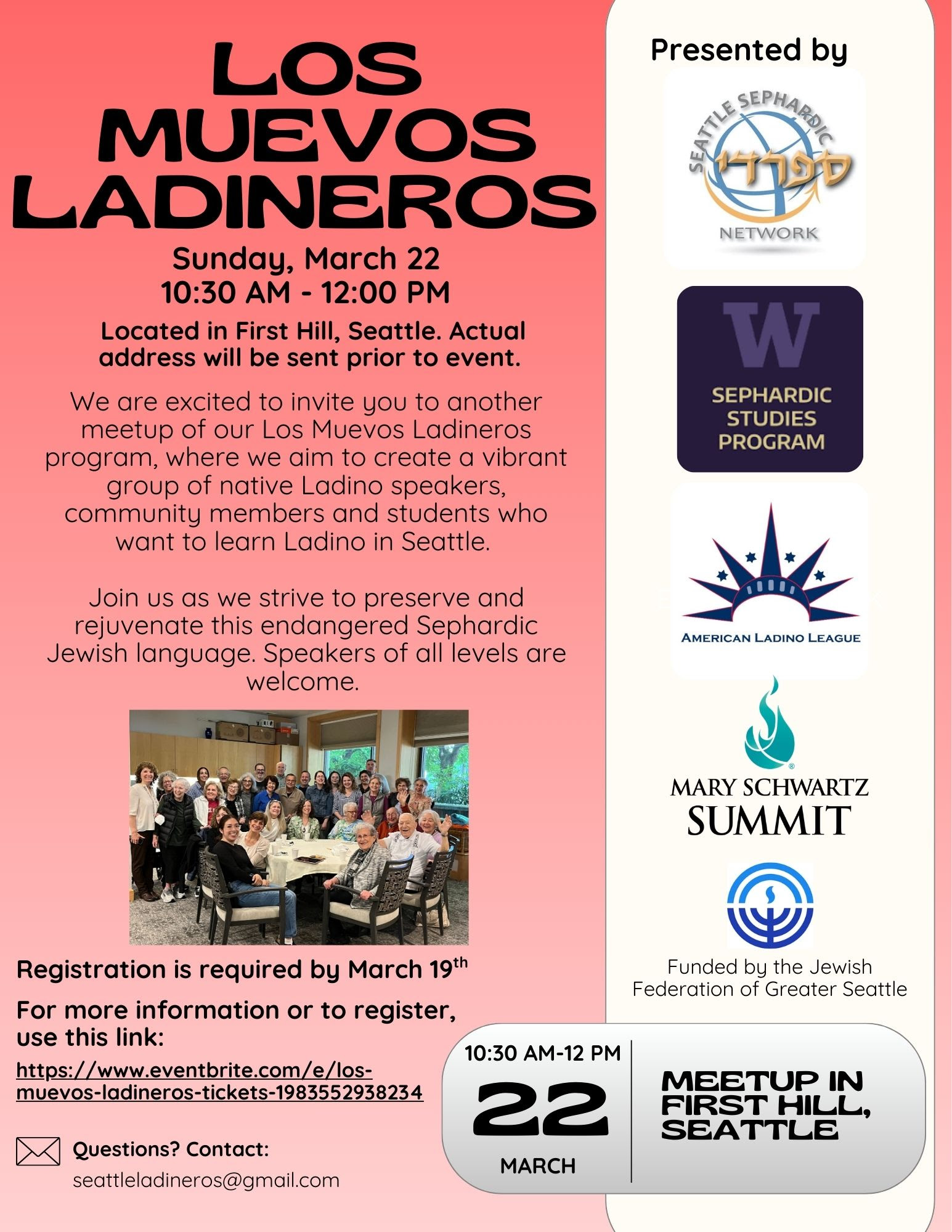 Ladino fans – and those who want to be Ladino fans – sign up for our next Los Muevos Ladineros meetup on Sunday, March 22, in First Hill, Seattle, sponsored by American Ladino League, Seattle Sephardic Network, and Sephardic Studies at the University of Washington.