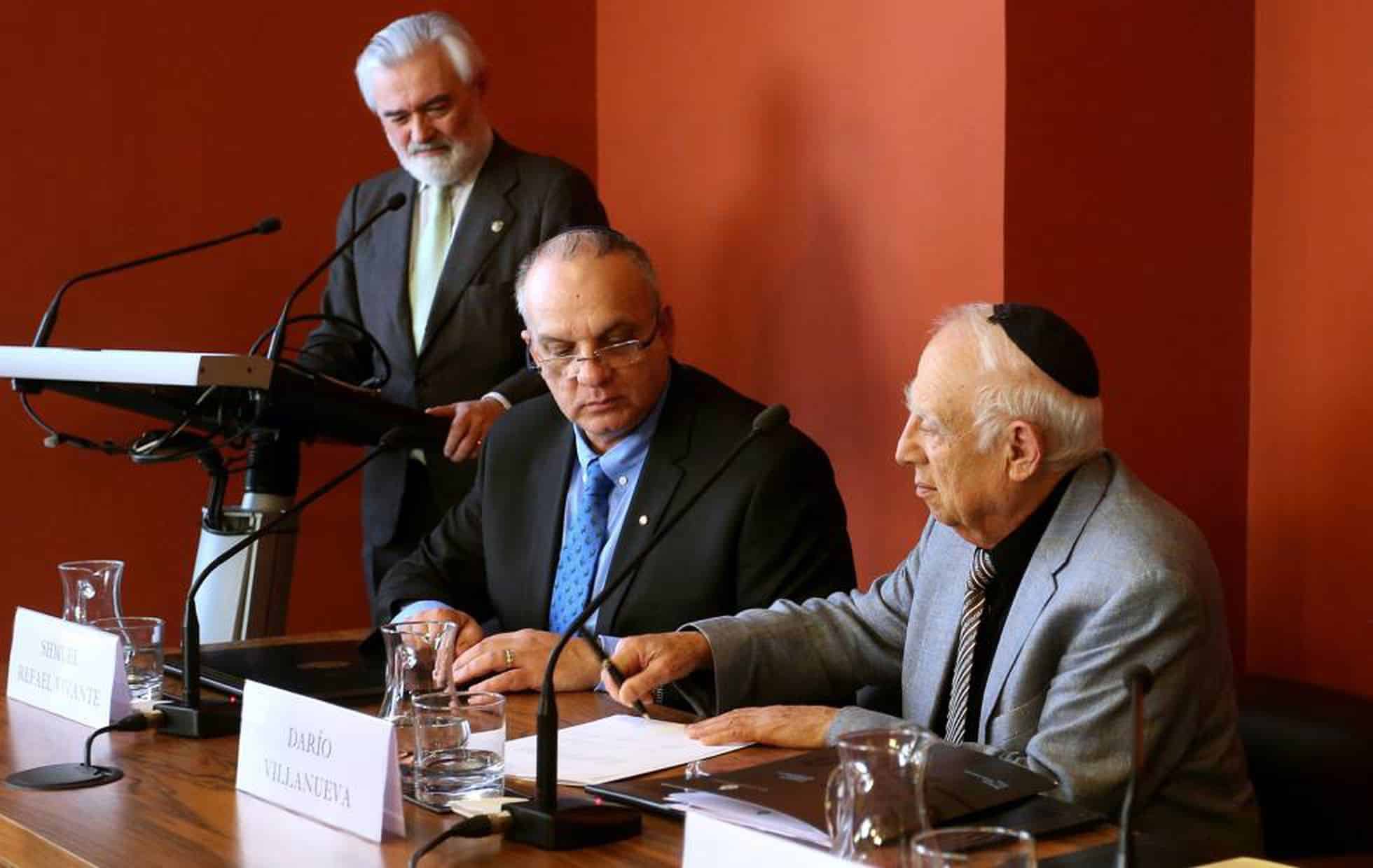 El entonces director de la RAE, Darío Villanueva (de pie), Shmuel Refael Vivante y Jacob Bentolila, en la constitución de la academia del ladino en Madrid, en 2018. JAIME VILLANUEVA