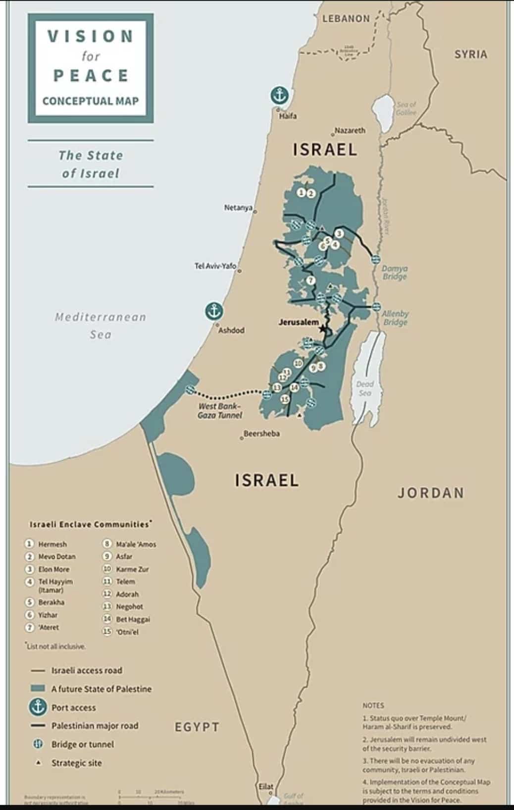 C- La infrastruktura de los territoryos israelianos komo palestinianos se kompletara afin ke ayga una kontinuedad ariento de eyos. Lo ke kere dizer kaminos, pontes, tuneles i transportos ferroverikos nuevos. Yerushalayim sera la kapitala endevizivle de Israel, i el foburgo de Abu Dis la kapitala ‘el Kuds’ de la Palestina. Yerushalayim sera avierta a todas las religiones sin dinguna limit.