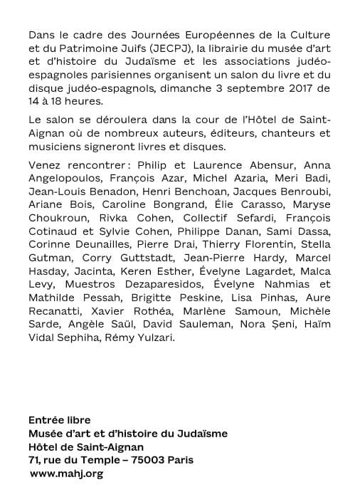 Vidas Largas espère vous revoir à la rentrée au centre communautaire, mais, avant vous pourrez venir le 3 septembre 2017 au MAHJ (Musée d’art et d’histoire du Judaïsme), 71 rue du Temple 75003 Paris, où aura lieu le salon du livre et du disque Judéo-Espagnol.