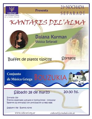 Este año CIDiCSef abre su ciclo de actividades 2009 con una Nochada Sefaradí que constará de 2 partes, en la primera parte se podrán disfrutar hermosas melódias de nuestra música sefaradí tradicional en la hermosa voz de Daiana Kurman y en la segunda parte la excelente música griega del grupo Bouzukia. Además se …