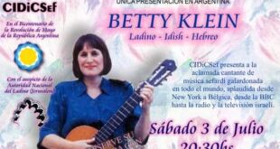 SÁBADO 3 DE JULIO – 20:30HS 24º GRAN NOCHADA INTERNACIONAL: ”De Jerudalem a Buenos Aires” – Ladino, Idish, Hebreo Única presentación en Argentina de Betty Klein Entradas: 54-11-4861-0686 cidicsef@ciudad.com.ar Betty Klein, cantante de folclor internacional, guitarrista, pianista, arpista y acordeonista originaria de New York, estudió con Marta Schlamme en el Mannes …