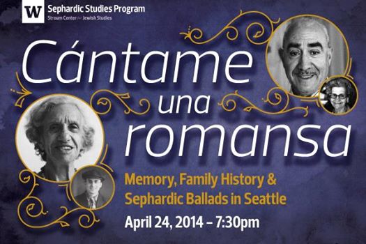 Event: Cántame una romansa: Memory, Family History, and Sephardic Ballads in Seattle Start: 4/24/2014 7:30 pm End: 4/24/2014 9:30 pm Category: Public Events, UW Academics, UW Campus Events Organizer: Stroum Center for Jewish Studies Phone: 206-543-0138 Email: jewishst@uw.edu Updated: 7/12/2013 Venue: Kane Hall 110 Phone: 206-543-0138 Address: Seattle, WA, 98101,United States In 1973, Rina Benmayor came to Seattle to record Judeo-Spanish ballads (romansas) in the Sephardic …