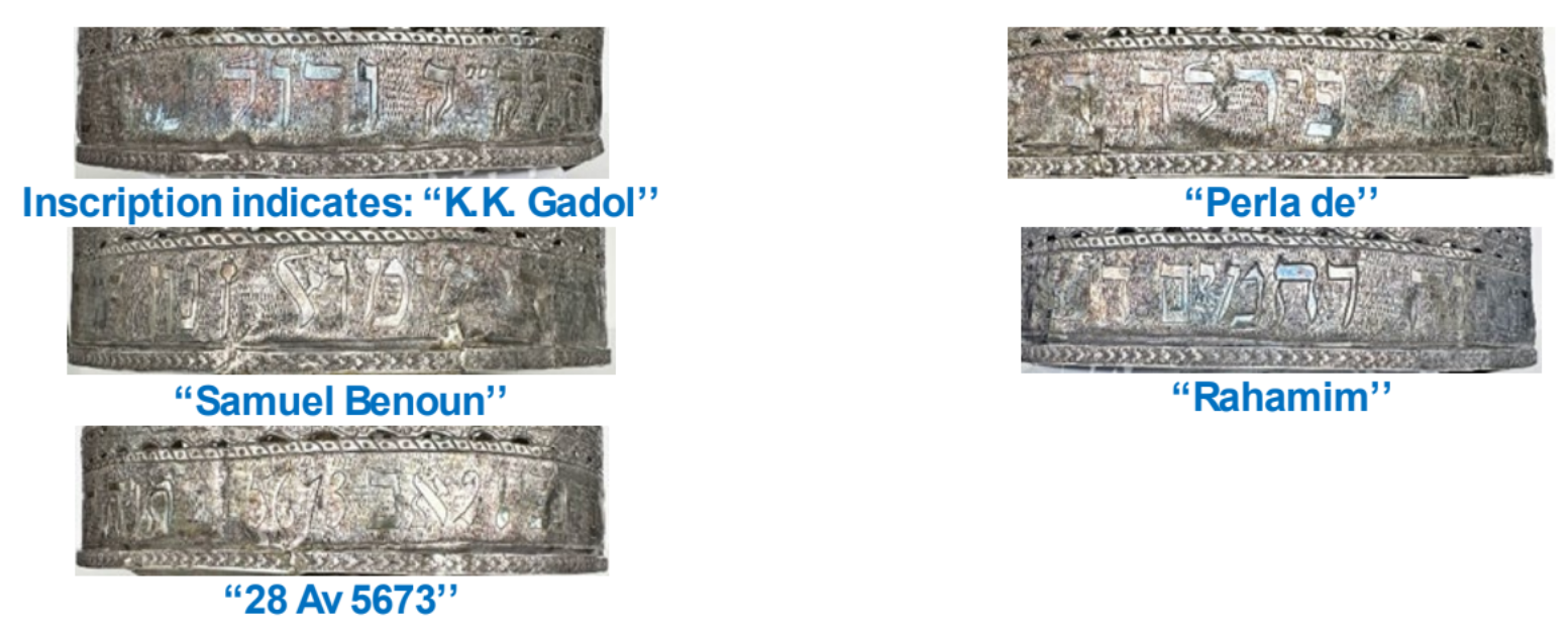Al observarla con más detenimiento, la Corona de la Torá es cilíndrica y está hecha de plata, un conocido estilo sefardí. Los intrincados diseños utilizados consistían en repetidos patrones florales o de hojas, cincelados y perforados. En el perímetro inferior, una inscripción grabada en hebreo y ladino dice: «Donación al Kahal Kadosh Gadol de la Sra. Perla de Samuel Benoun en memoria de su hijo Rahamim, fallecido el 28 de Av de 5673 [1913]». En la parte inferior de la corona aparece el nombre del artesano, Demetrio Cromida, un orfebre griego de Rodas que realizó trabajos por encargo dentro de la comunidad judía.