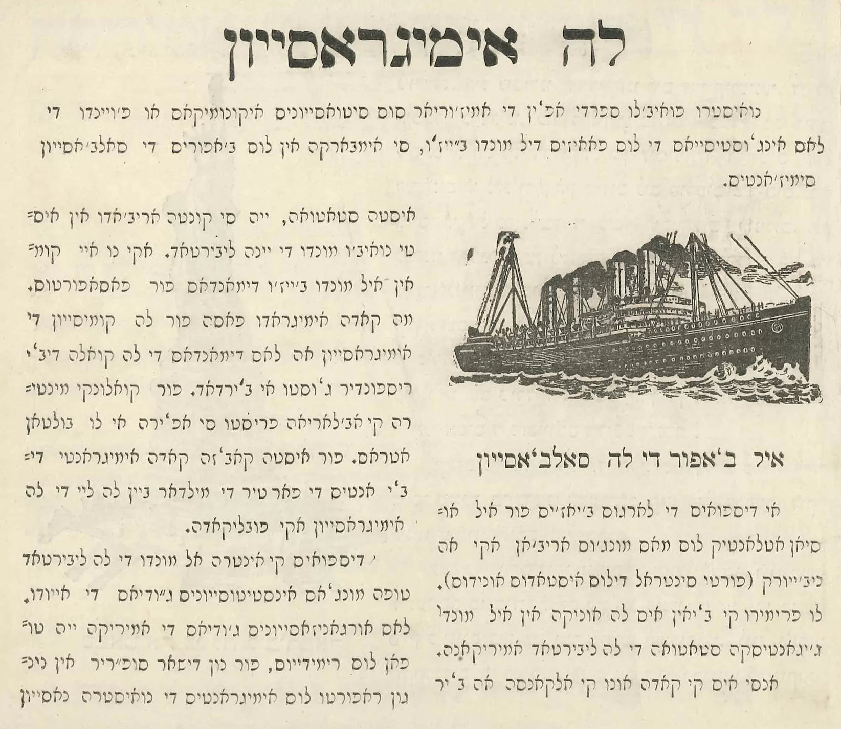 No sólo estaban en peligro su cultura y su estatus socioeconómico, sino que los judíos también comenzaron a temer por su seguridad cuando el gobierno griego comenzó a reclutarlos en el ejército durante la Primera Guerra Mundial. Albert Levy recordó en un artículo que publicó en otro periódico Ladino de Nueva York. periódico La Epoka de Nueva York (1919), que el deseo de evadir el servicio militar obligatorio llevó a muchos judíos de Salónica a abandonar la ciudad (él mismo, se puede suponer, entre ellos). El gobierno griego comenzó a incorporar reclutas judíos al ejército en 1916, el mismo año en que Albert Levy huyó del país. Jóvenes judíos como Levy buscaron pasaje para salir de Salónica con la esperanza de llegar a las costas de los Estados Unidos. Un incendio masivo en el centro de Salónica en 1917 que dejó sin hogar a cincuenta de los setenta mil judíos de la ciudad provocó una mayor emigración y contribuyó, como temían los líderes judíos, a la disminución del estatus de la “Jerusalén de los Balcanes”.