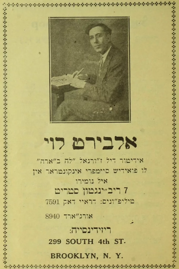 Albert Levy y su esposa Lucy se encontraban entre los casi cincuenta mil judíos del antiguo Imperio Otomano (especialmente Grecia y Turquía) que emigraron a Estados Unidos a principios del siglo XX. Según su petición de naturalización en los Estados Unidos presentada en 1925, Albert Levy, un “profesor de hebreo”, llegó a Nueva York, vía Patras, Grecia, en octubre de 1916. Debido al estatus confuso de Salónica en su transición de otomana a Bajo control griego, Levy, para convertirse en ciudadano estadounidense, se vio obligado a renunciar a su lealtad al “actual gobierno de Turquía y (o) al actual gobierno de Grecia”. Una vez en Estados Unidos, Levy fijó su residencia en Broome Street, en el Lower East Side, que se convirtió en un centro de la vida judía, incluso entre los judíos sefardíes. Allí, en el Lower East Side, Albert y Lucy tendrían a sus hijos: David (n. 1918), Rachel (n. 1922) y Jenny (n. 1928). Y allí, en el Lower East Side (y más tarde, brevemente, en Brooklyn), Albert trasplantó su amor por el periodismo, su devoción a la educación y su dedicación a las causas judías mientras buscaba contribuir al mejoramiento social e intelectual de sus compañeros inmigrantes sefardíes.