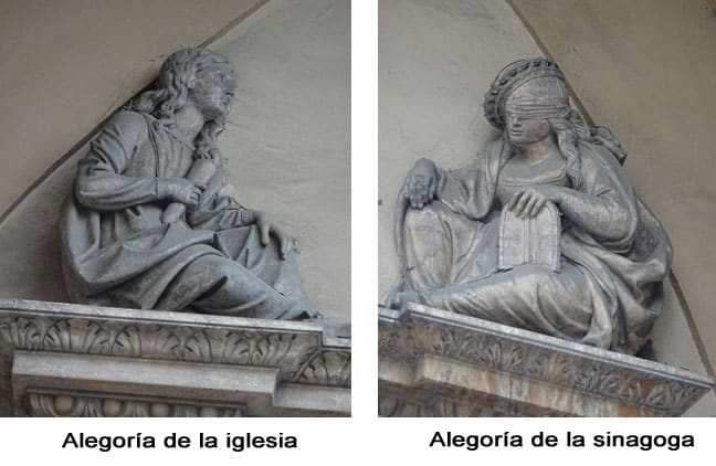 Una alegoría es una representación en la que las figuras y detalles tienen un significado simbólico. El tercer y último cuerpo de la portada-retablo, a ambos lados del Calvario (Cristo crucificado con María y San Juan), se custodia dos alegorías femeninas que simbolizan a la iglesia (figura de la izquierda) y a la sinagoga (figura de la derecha); un esquema que se repite en pocos retablos y portadas renacentistas.